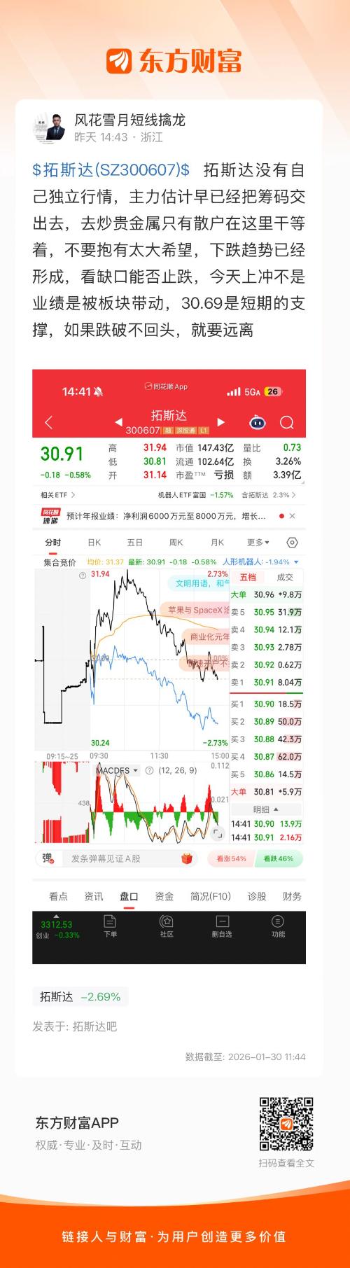 $拓斯达(SZ300607)$ 拓斯达没有自己独立行情,主力估计早已经把筹码交出去,去炒贵金属只有散户在这里干等着,不要抱有太大希望,下跌趋势已经形成,看缺口能否止跌,今天上冲不是业绩是被板块带动,30.69是短期的支撑,如果跌破不回头,就要远离