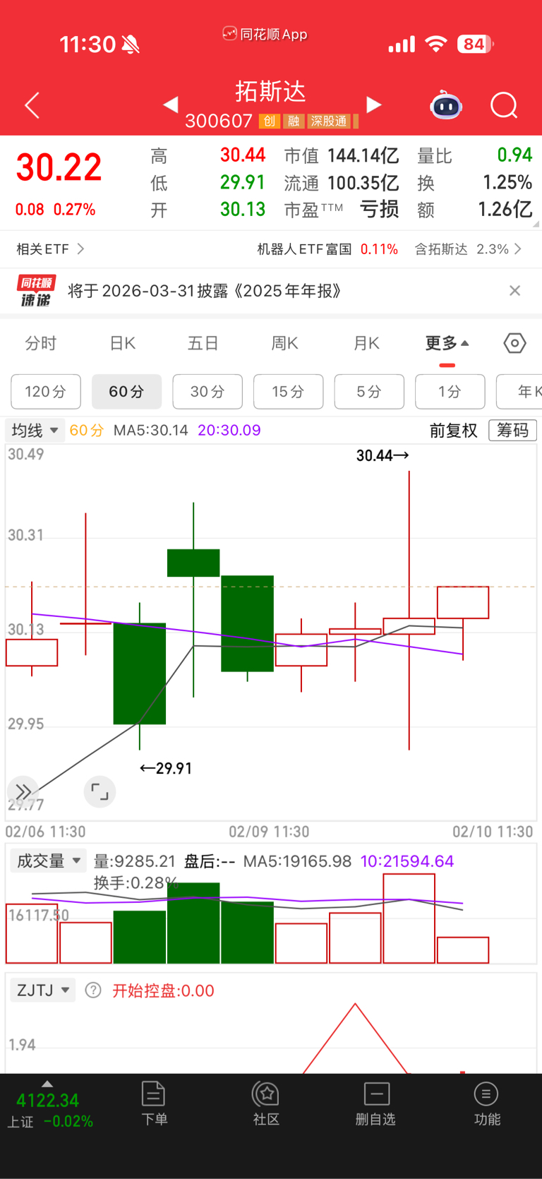 $拓斯达(SZ300607)$ 60分钟级别,速度加仓兄弟们30.44,对子,哈哈哈,懂得人自然懂