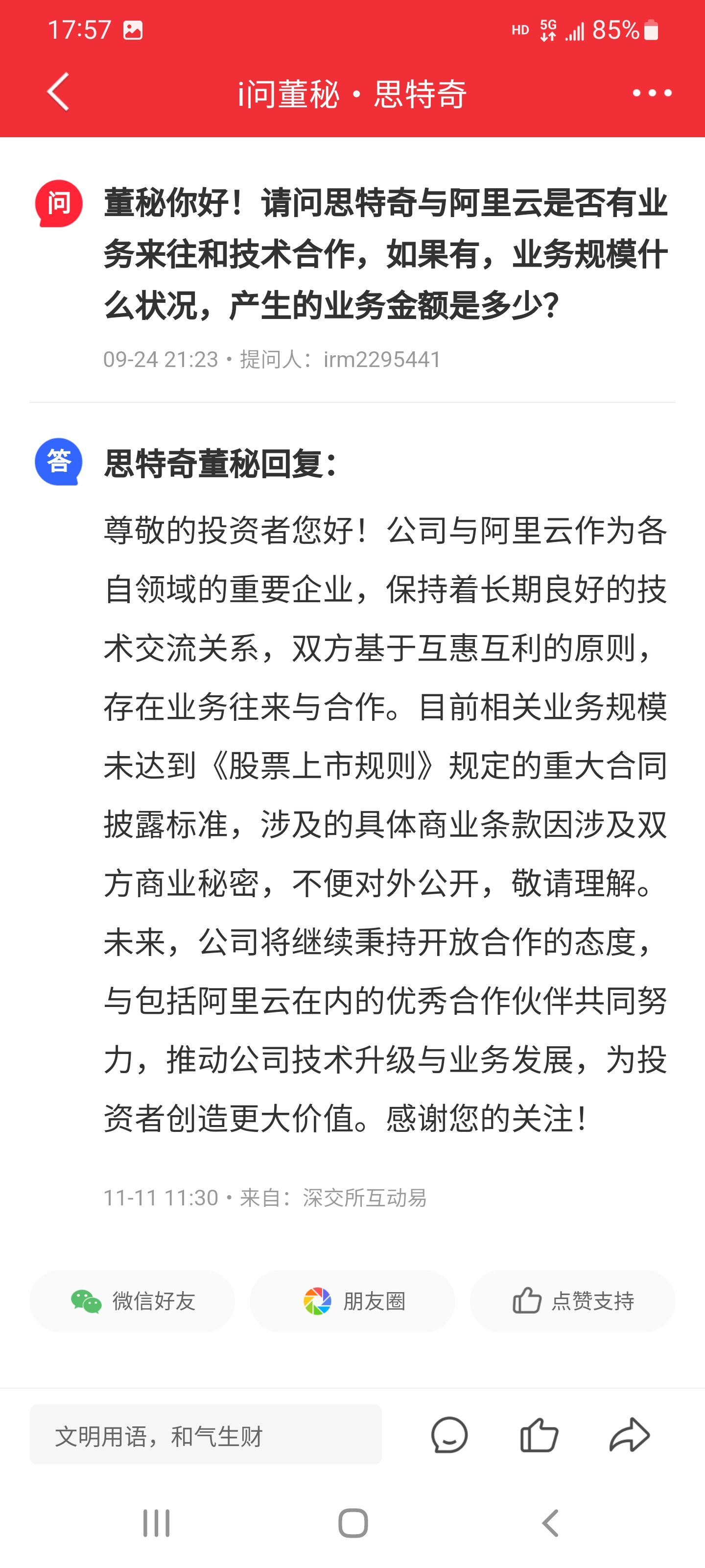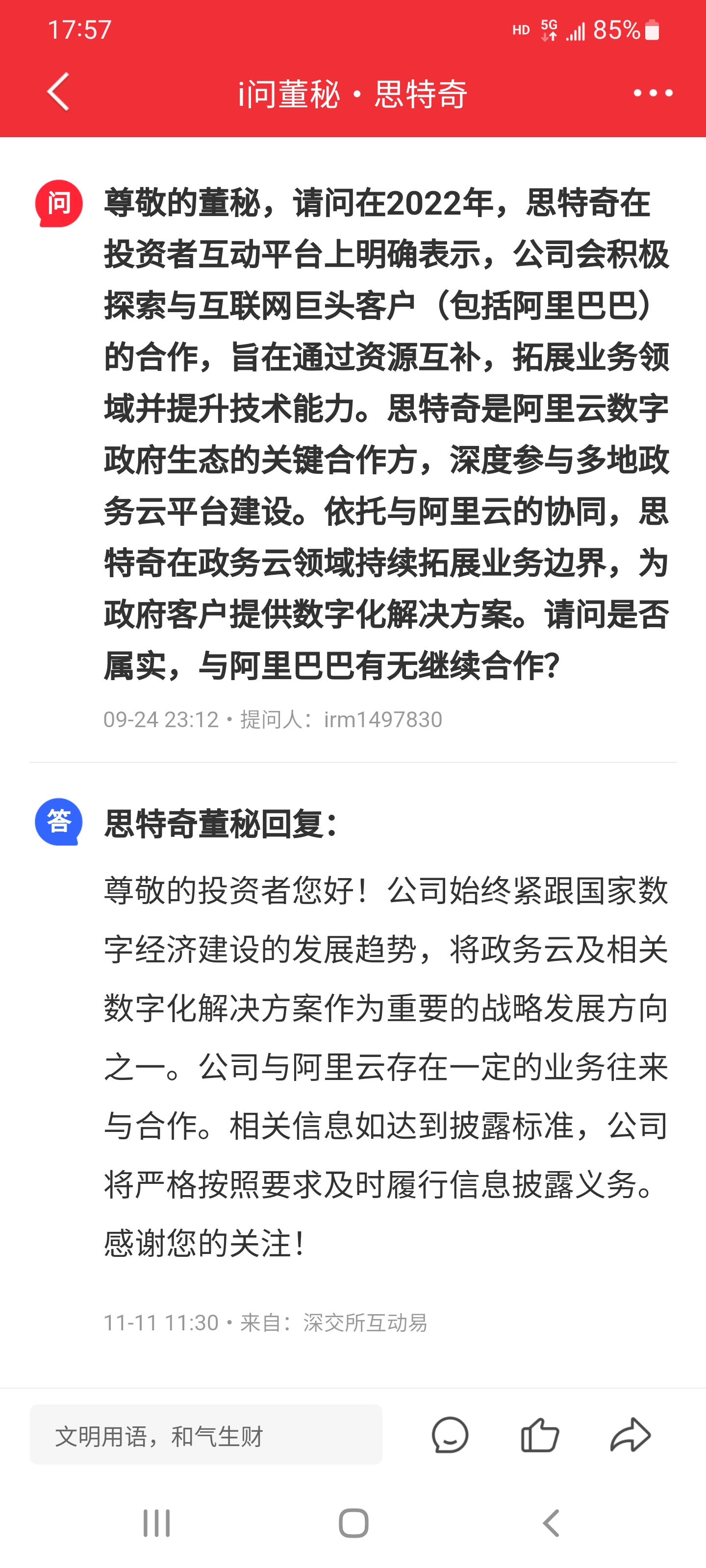 $思特奇(SZ300608)$ 原来是这么回事!!!思特奇与阿里云存在一定的业务往来与合作,与阿里云作为各自领域的重要企业,保持着长期良好的技术交流关系,双方基于互惠互利的原则,存在业务往来与合作。未来,公司将继续秉持开放合作的态度,与包括阿里云在内的优秀合作伙伴共同努力,推动公司技术升级与业务发展,为投资者创造更大价值。