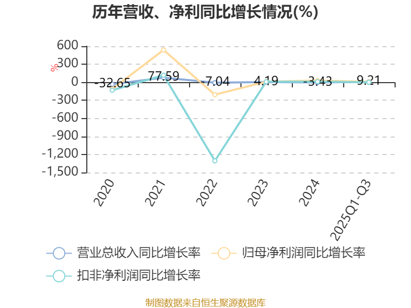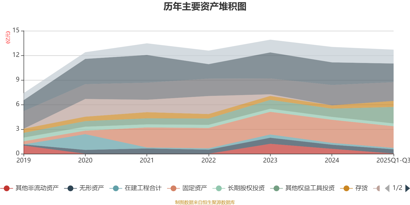 资产重大变化方面,截至2025年三季度末,公司其他权益工具投资较上年末增加100.77%,占公司总资产比重上升8.17个百分点;其他非流动资产较上年末减少96.65%,占公司总资产比重下降4.45个百分点;货币资金较上年末减少17.69%,占公司总资产比重下降3.27个百分点;存货较上年末增加83.62%,占公司总资产比重上升2.72个百分点。