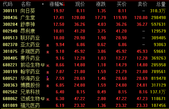近期疲弱的医药板块盘中拉升,创新药概念等表现亮眼。截至收盘,向日葵20%涨停,广生堂涨超17%,舒泰神涨超12%,昂利康、联环药业、亚太药业亦涨停。
