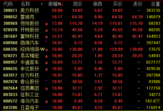汽车产业链股盘中发力走高,截至收盘,美力科技20%涨停,雷迪克涨超16%,恒帅股份、开特股份涨超13%,渤海汽车、中通客车、香山股份、海马汽车等均涨停。