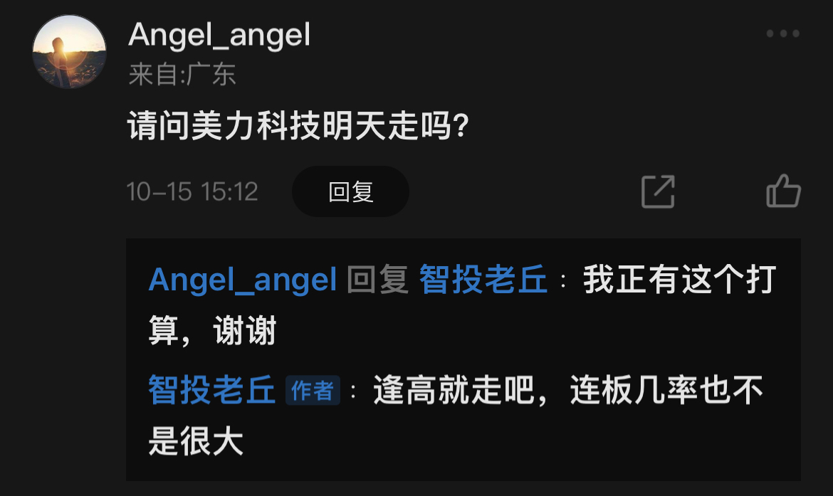 $美力科技(SZ300611)$ 昨天评论区就有人问今天走势如何?这波预判六不六,在高点离场,落袋为安。
