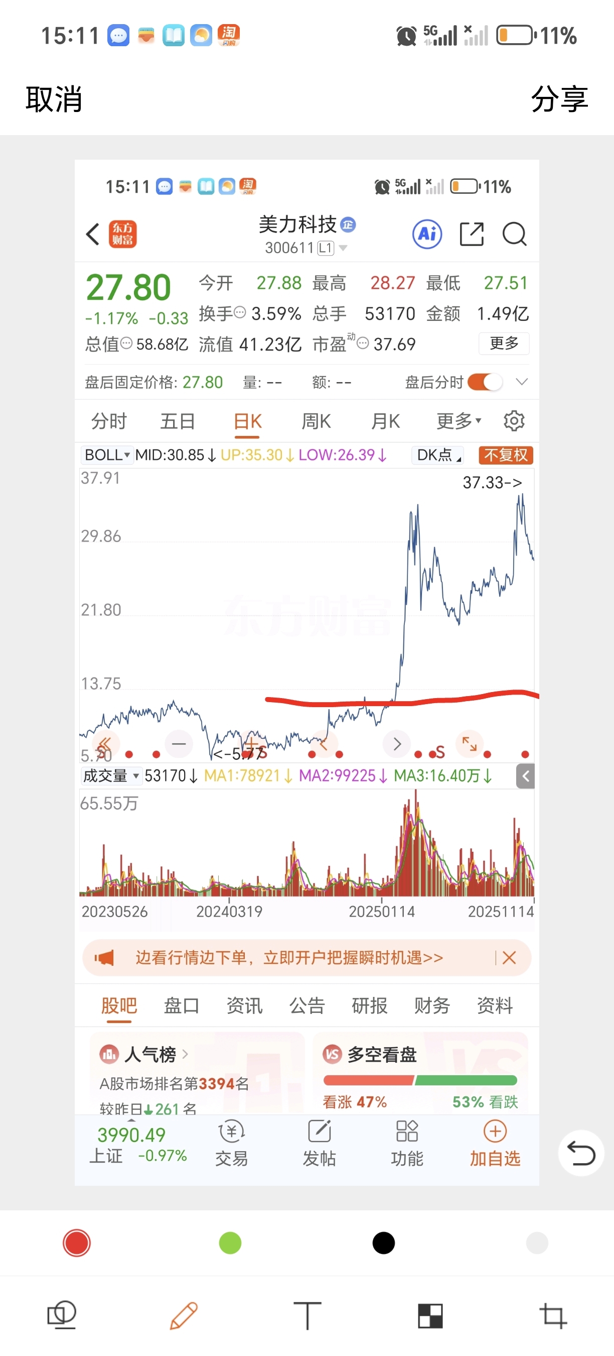 $美力科技(SZ300611)$ 不知道要跌多久跌到红线