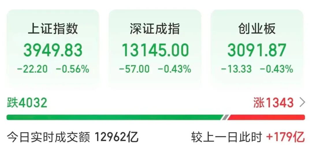 截至上午收盘,上证指数下跌0.56%,深证成指下跌0.43%,创业板指下跌0.43%。市场半日成交额超1.29万亿元。