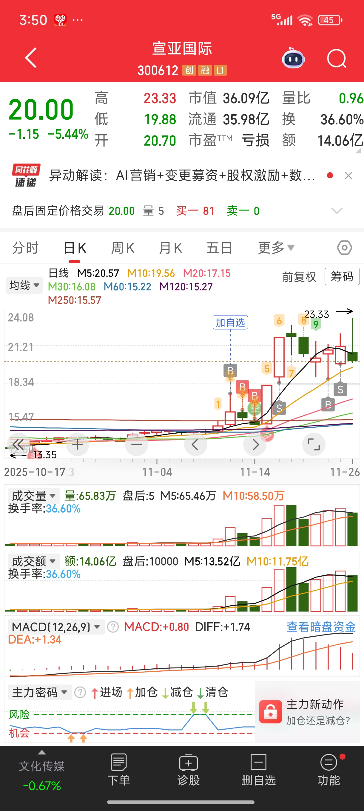 $宣亚国际(SZ300612)$ 半层仓位吃 两个板,加前天水下炒底十几个点,宣亚吃了50%利润。今天低开不多就没进了我是多么小的心脏