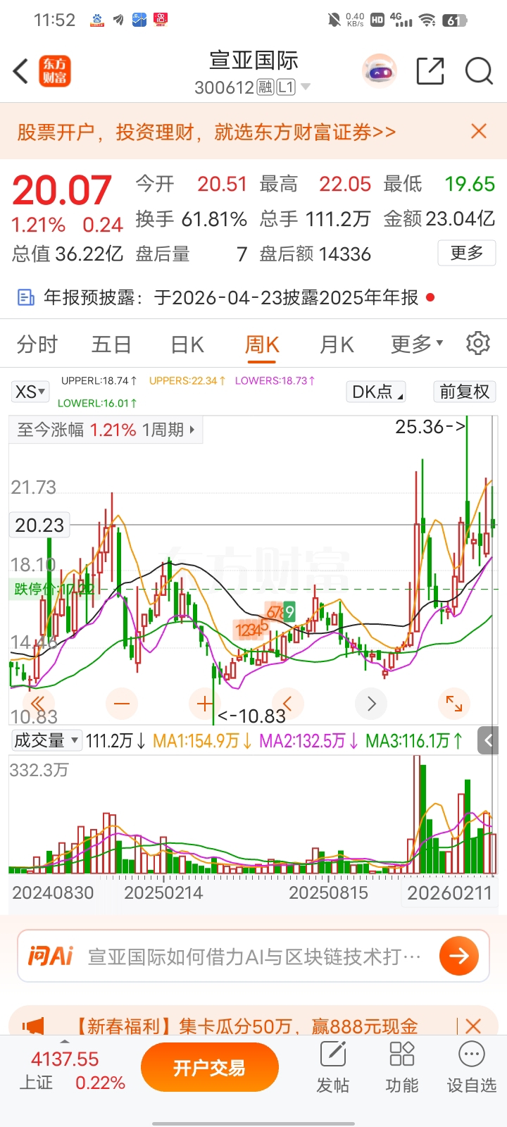 $宣亚国际(SZ300612)$ 20.22这是一个平台,有行情就翻倍,没行情也就是震荡出货