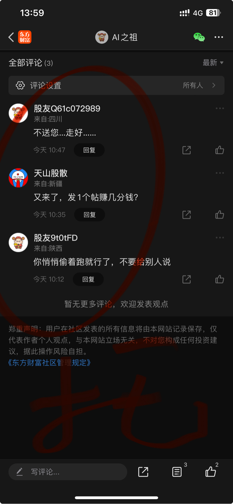 温馨提示: 1.根据《证券法》规定,禁止编造、传播虚假信息或者误导性信息,扰乱证券市场;2.用户在本社区发表的所有资料、言论等仅代表个人观点,与本网站立场无关,不对您构成任何投资建议。用户应基于自己的独立判断,自行决定证券投资并承担相应风险。《东方财富社区管理规定》