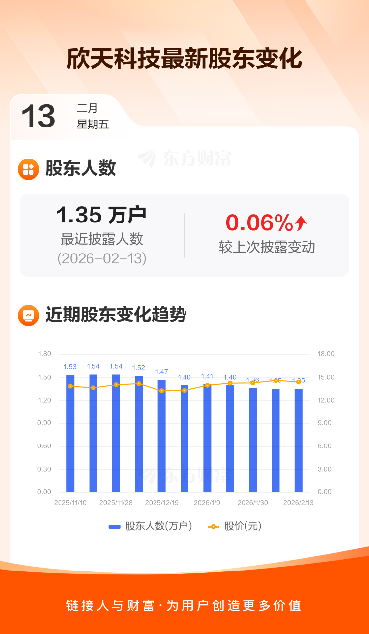 欣天科技:截至2月13日最新股东户数1.35万户,较上期增加0.06%