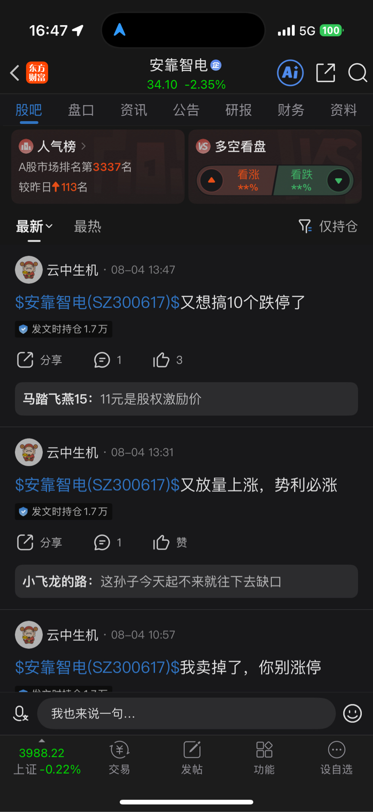 温馨提示: 1.根据《证券法》规定,禁止编造、传播虚假信息或者误导性信息,扰乱证券市场;2.用户在本社区发表的所有资料、言论等仅代表个人观点,与本网站立场无关,不对您构成任何投资建议。用户应基于自己的独立判断,自行决定证券投资并承担相应风险。《东方财富社区管理规定》