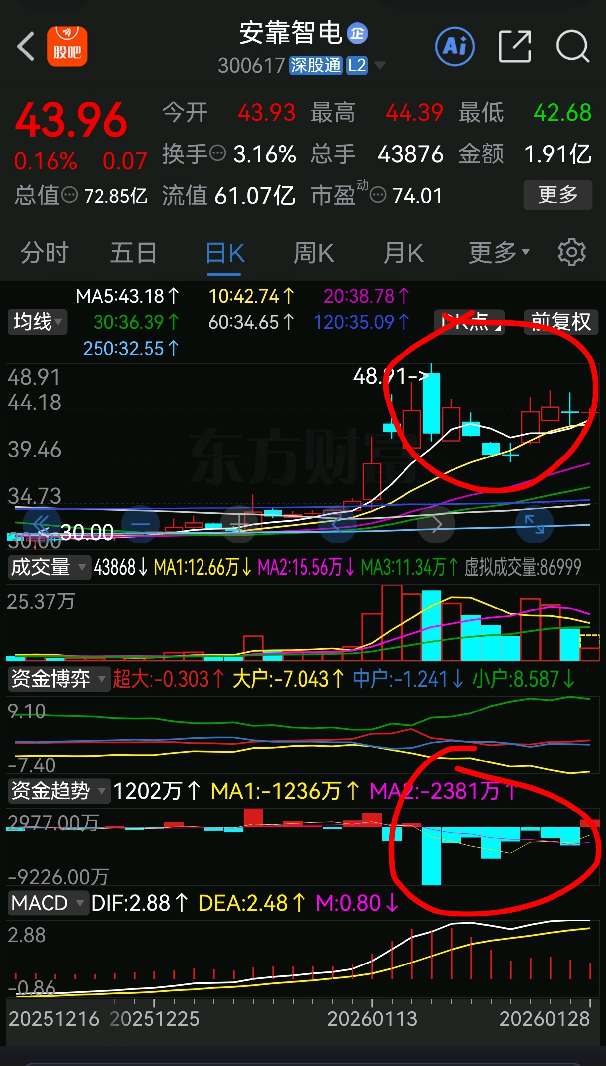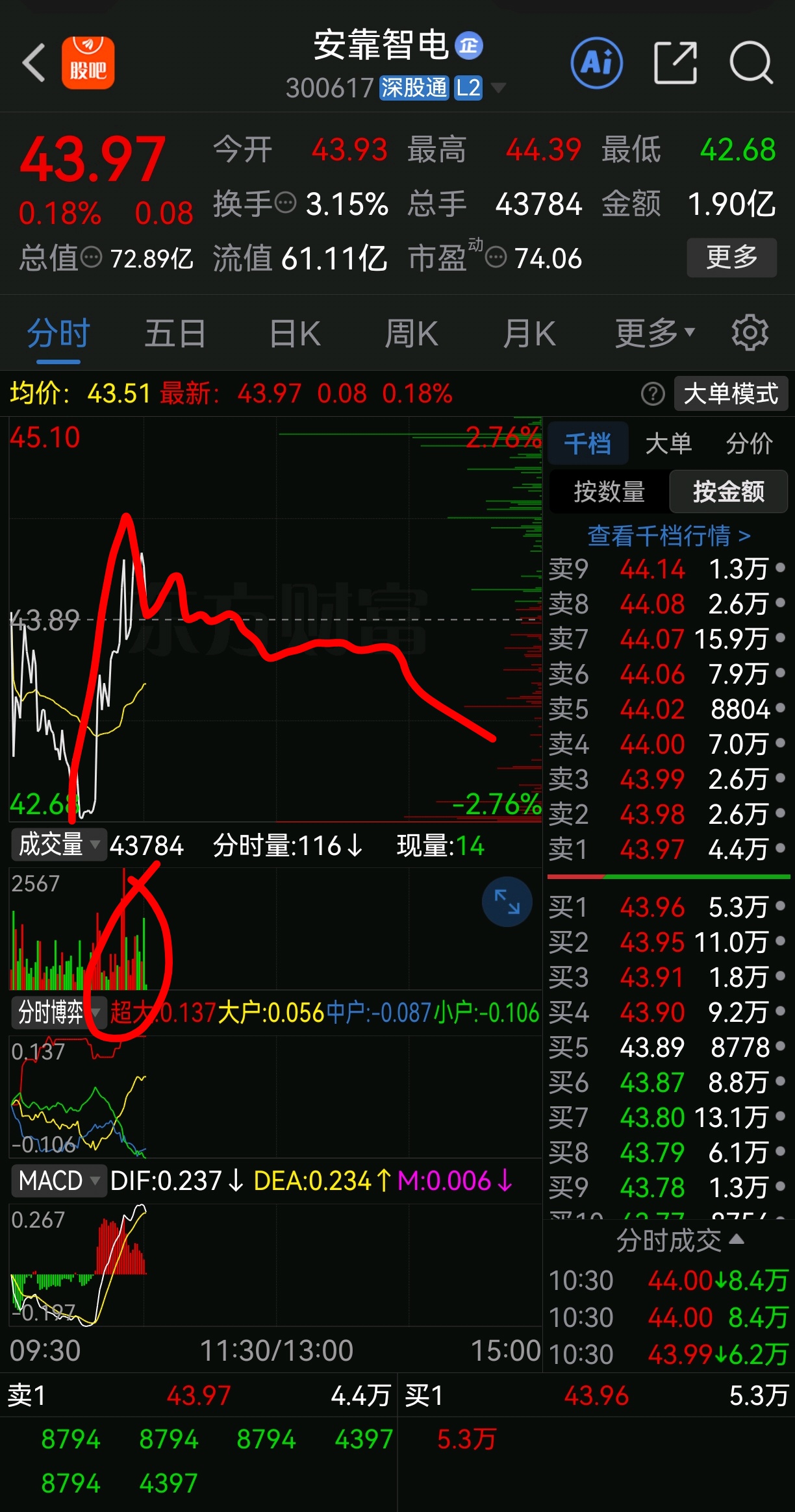 $安靠智电(SZ300617)$ 安靠是两市唯一一家公告获得北美大单的电气设备公司,但是股价走势基本上是最烂的,连纯跟风的二流走势都不如,主要还是没有辨识度,老庄砸盘,卖盘太大,稍微反弹各路资金都是大卖单出货。这票短时间很难有起色,做短线的散户基本都是割肉为主。