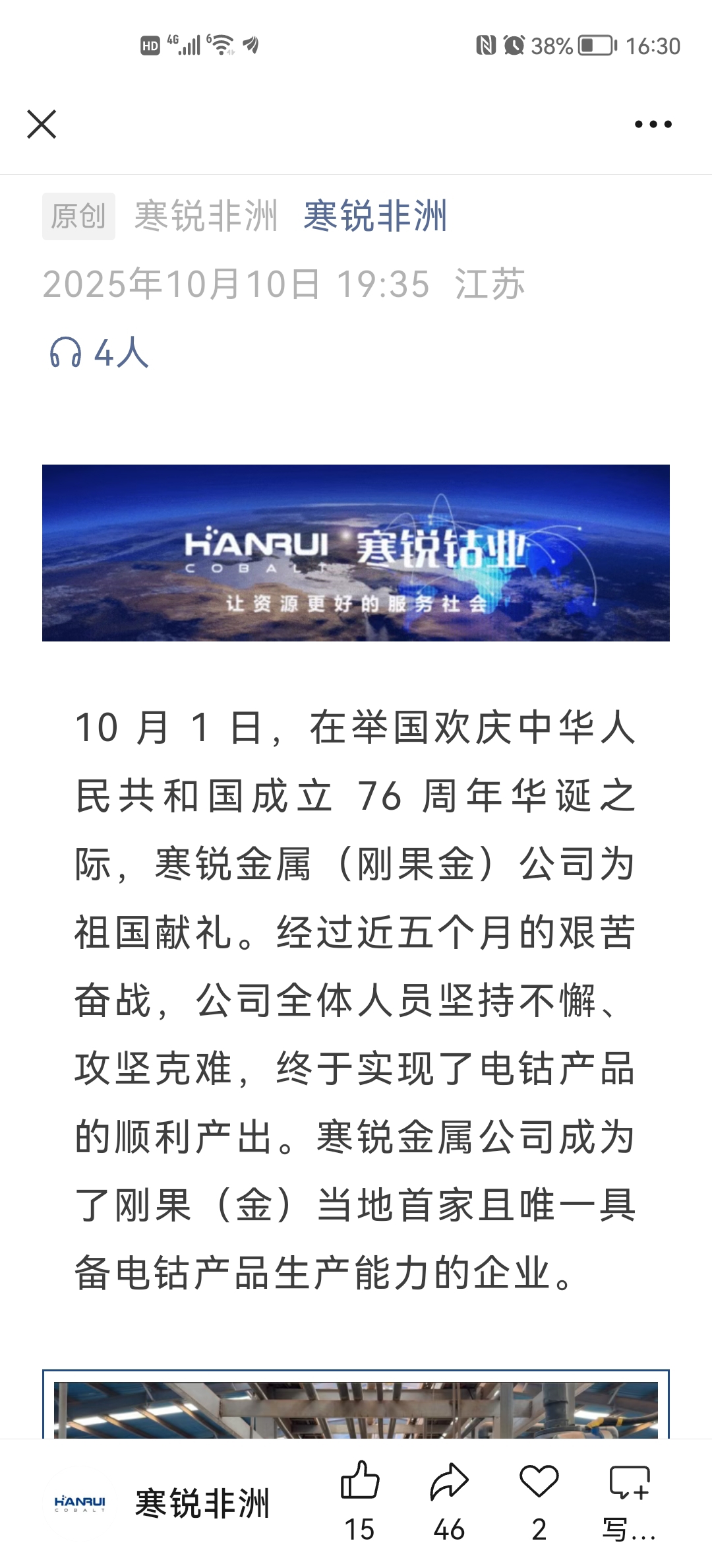 $寒锐钴业(SZ300618)$ 真在刚果生产电钴了