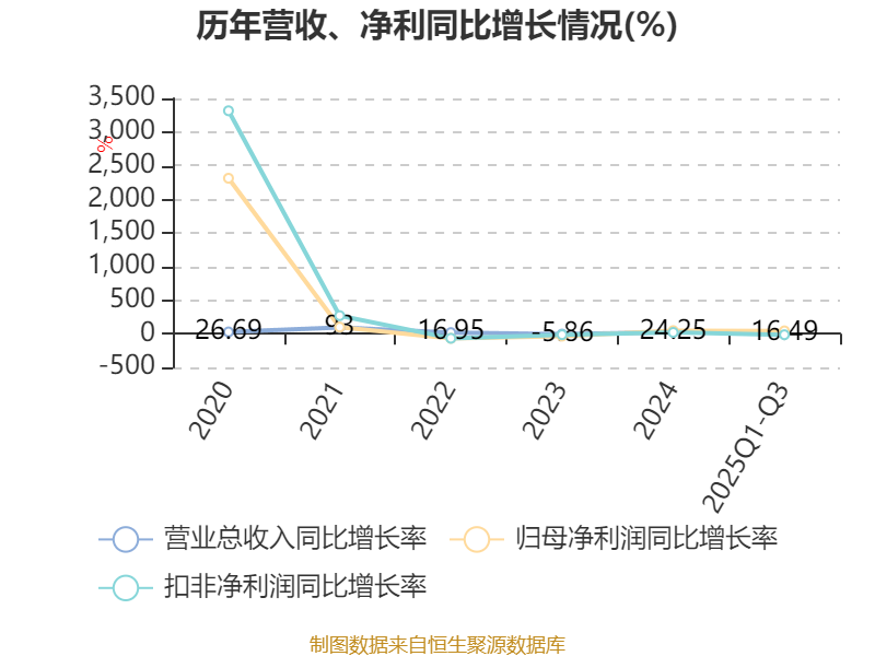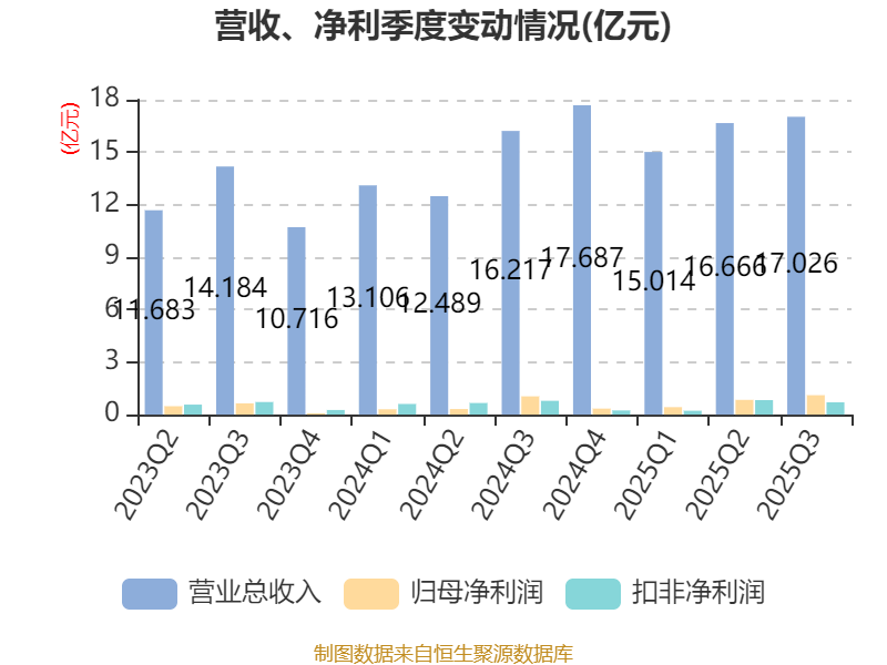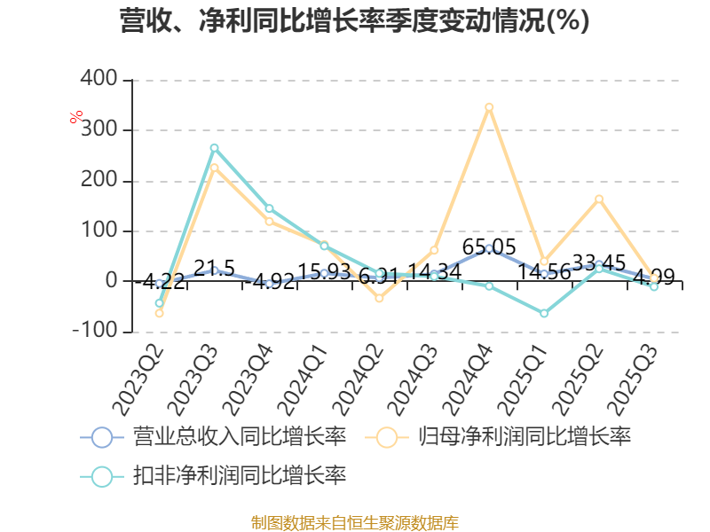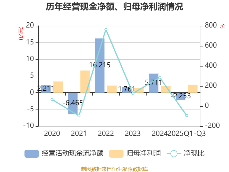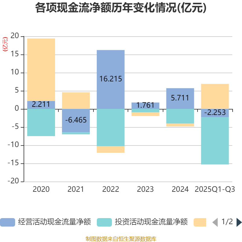 2025年前三季度,公司经营活动现金流净额为-2.25亿元,同比减少3.98亿元;筹资活动现金流净额6.89亿元,同比增加4.1亿元;投资活动现金流净额-13.05亿元,上年同期为-3.6亿元。