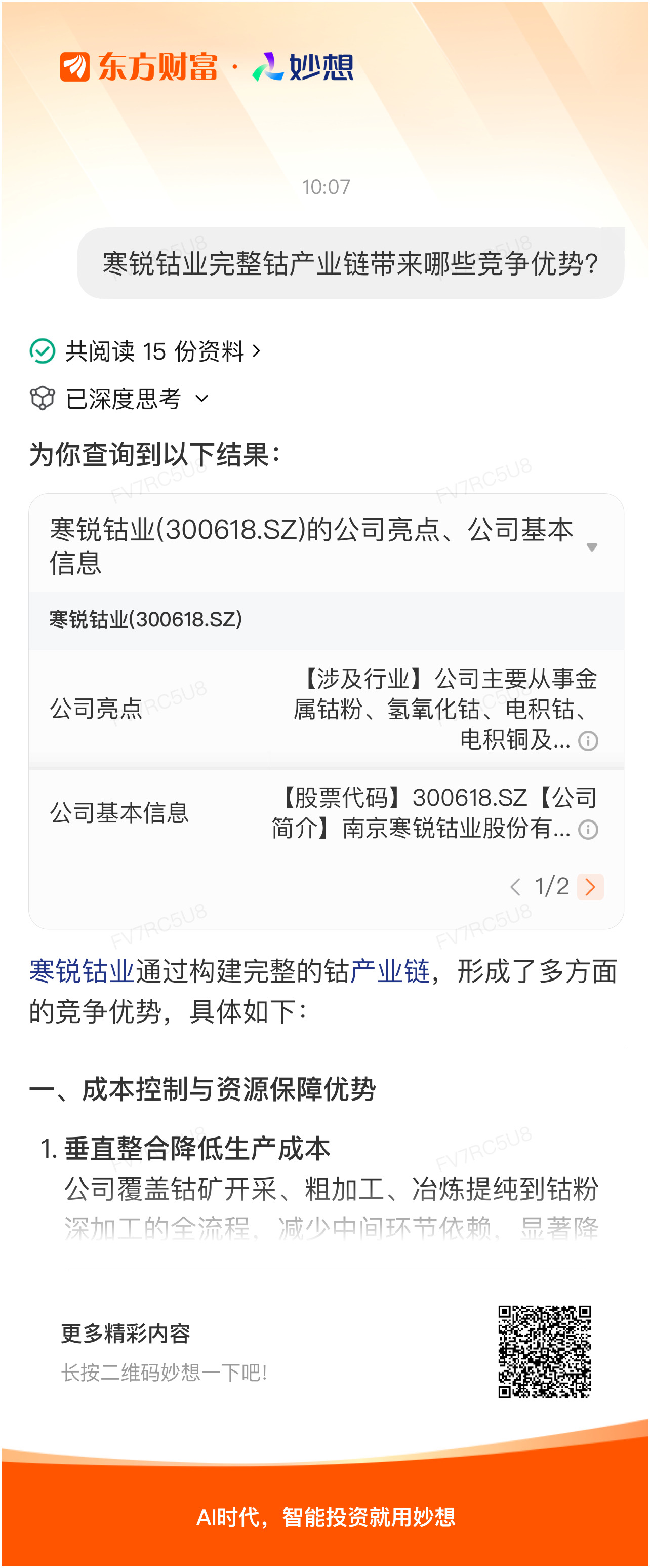 #@妙想,你怎么看?# 妙想一下:寒锐钴业完整钴产业链带来哪些竞争优势?