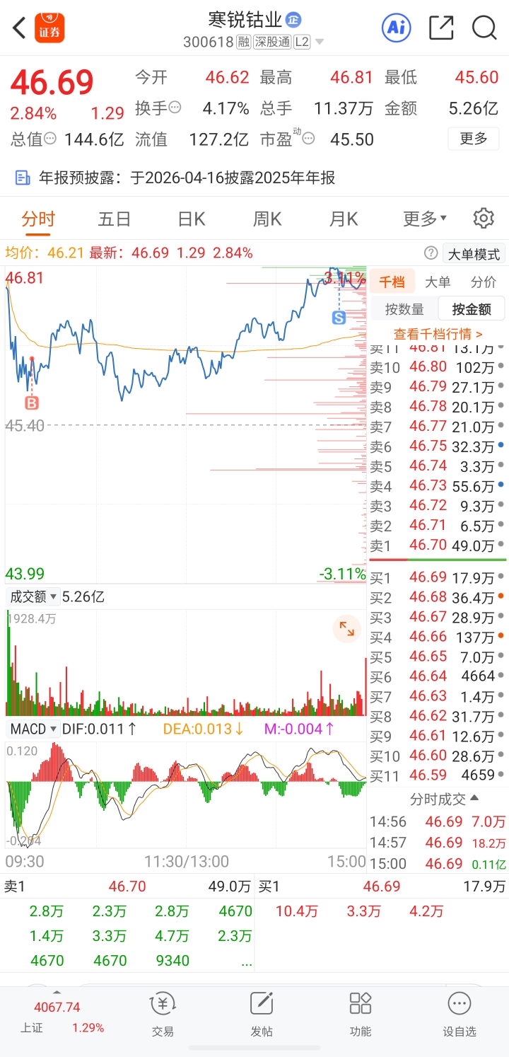 $寒锐钴业(SZ300618)$ 继续t,今天t两个点