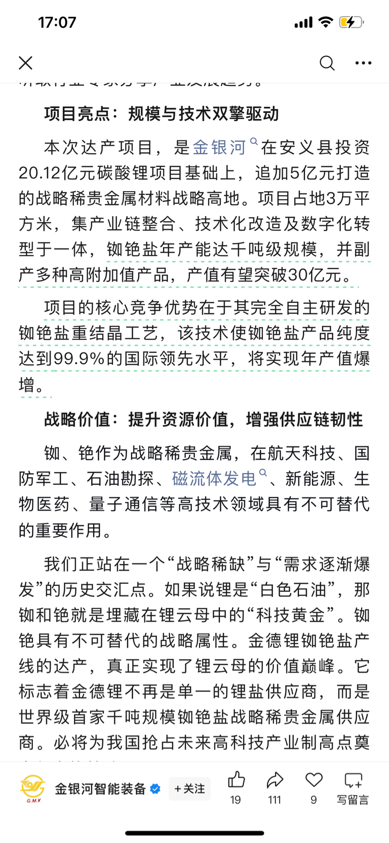 本次达产项目,是金银河在安义县投资20.12亿元碳酸锂项目基础上,追加5亿元打造的战略稀贵金属材料战略高地。项目占地3万平方米,集产业链整合、技术化改造及数字化转型于一体,铷铯盐年产能达千吨级规模,并副产多种高附加值产品,产值有望突破30亿元。