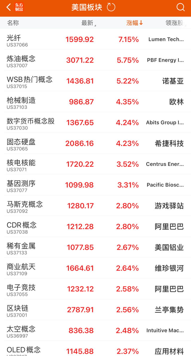 美股光纤板块大涨,板块涨7.15%……排名第一