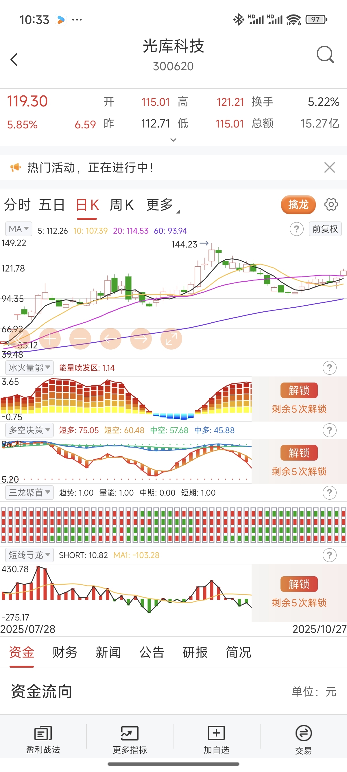 $光库科技(SZ300620)$ 做短线的120可以了,已卖。或许会卖飞,但还是保利润稳当点,下次波段可以再入。
