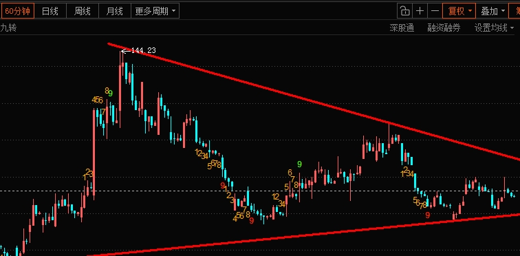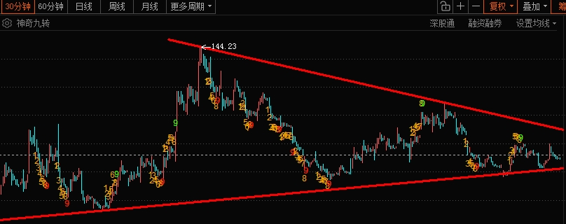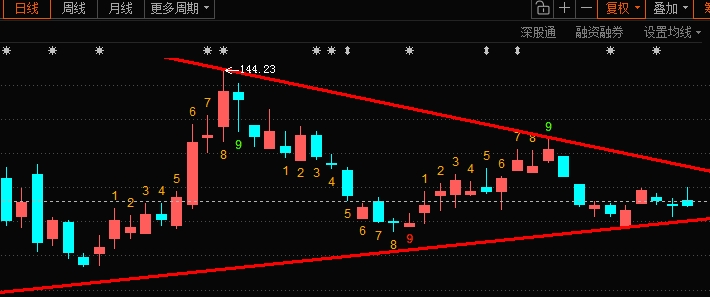 从中期、短期来看裤子在走收敛三角形(三角旗型),马上到旗尖了,这周内应该会变盘啦