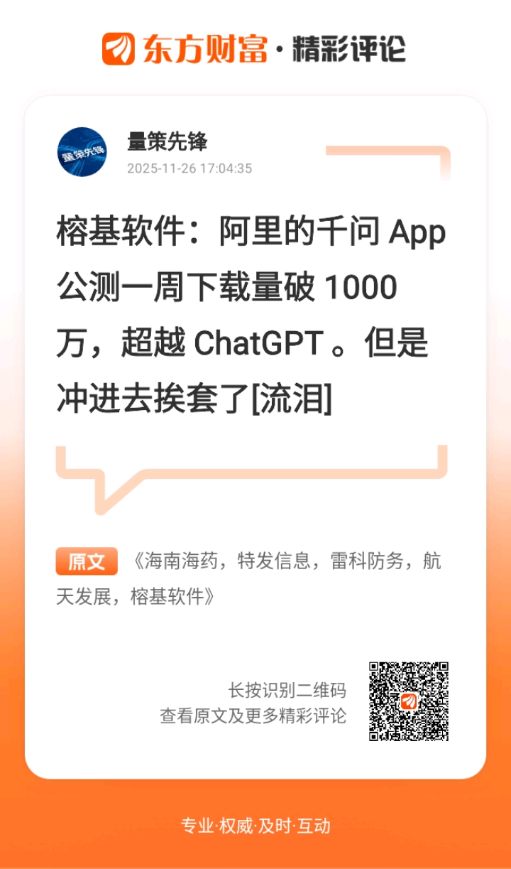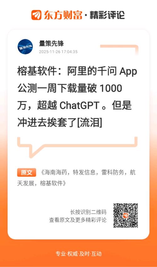 //@量策先锋 :榕基软件:阿里的千问 App 公测一周下载量破 1000 万,超越 ChatGPT 。但是冲进去挨套了[流泪] $光库科技(SZ300620)$$沪电股份(SZ002463)$$航天动力(SH600343)$