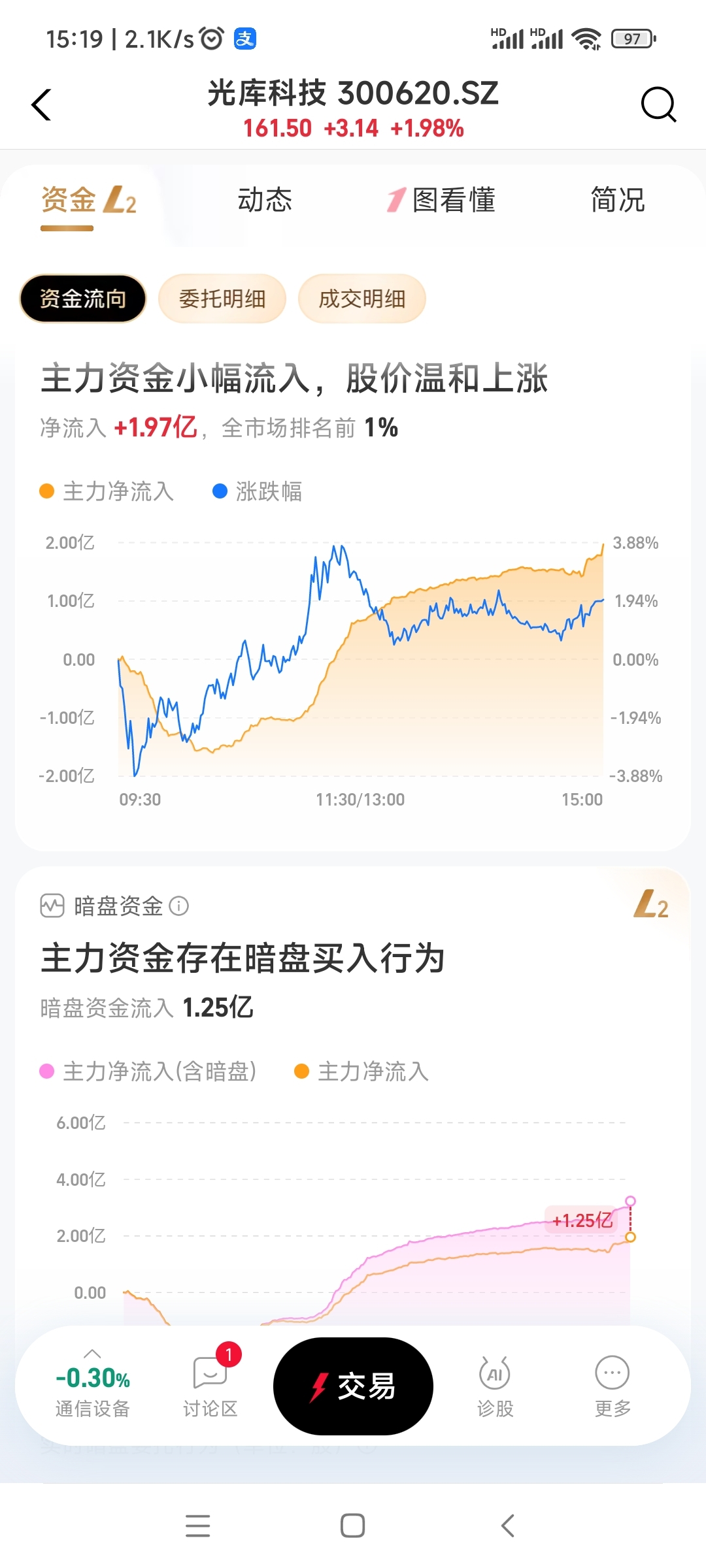 $光库科技(SZ300620)$ 明天还有行情,明天同样不要被开盘的急刹吓到,钱一直在流入,就是站不起来,明显是老庄在压盘吸筹。