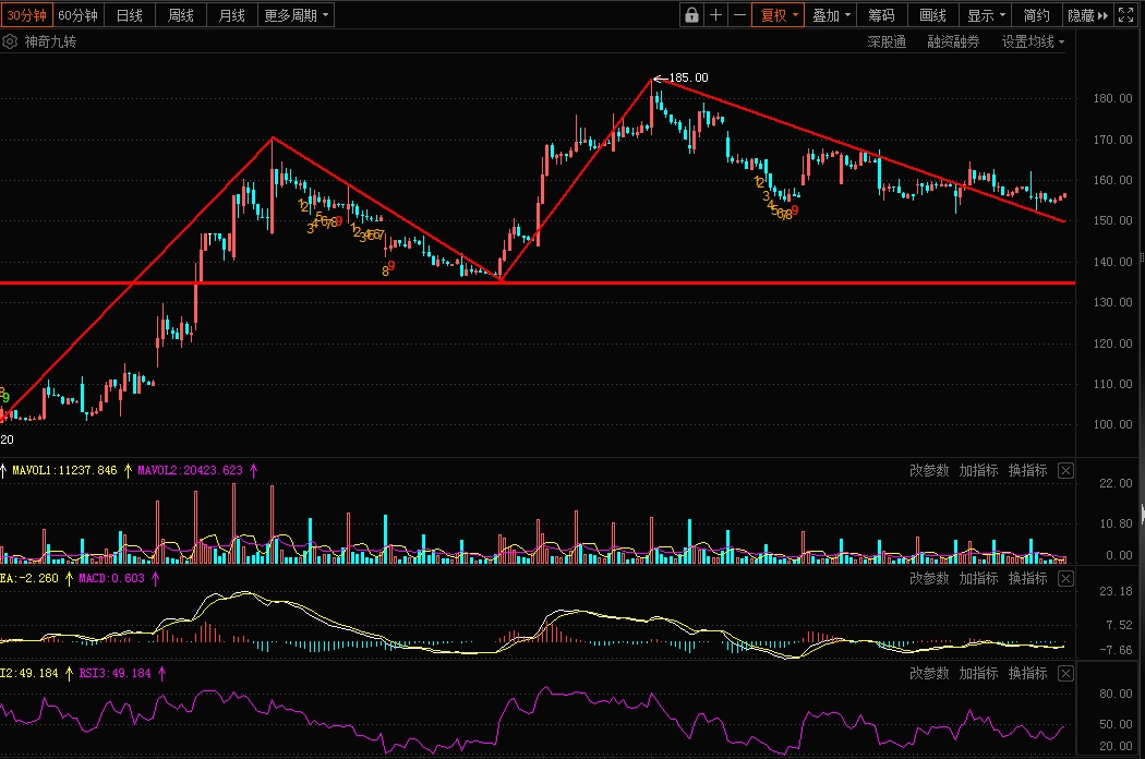 从三十分钟K线图来看,从100开始上涨的这一波段已经走了四笔,第四笔还没走完,还