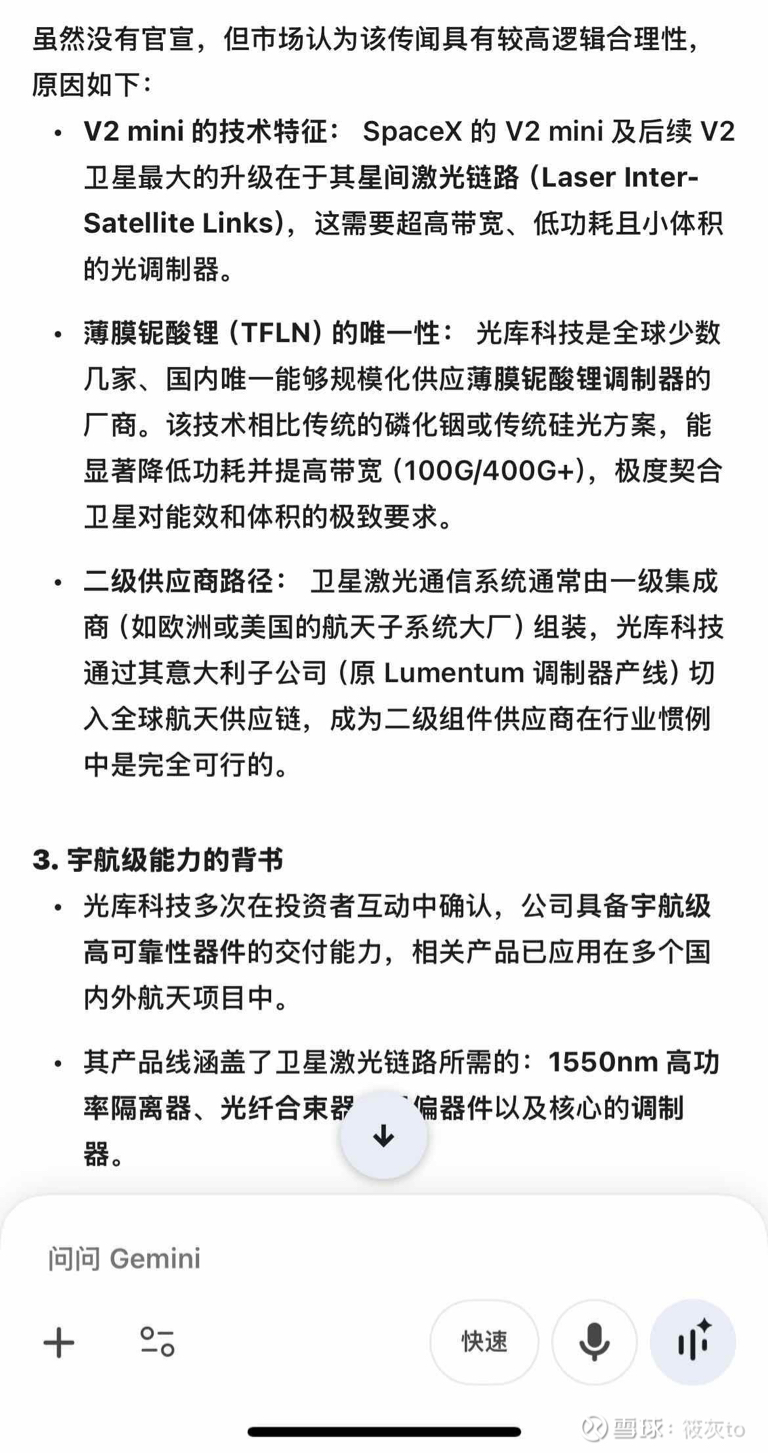 • 二级供应商路径: 卫星激光通信系统通常由一级集成商(如欧洲或美国的航系统大厂)组装,光库科技通过其意大利子公司(原 Lumentum 调制器产线)切入全球航天供应链,成为二级组件供应商在行业惯例中是完全可行的。