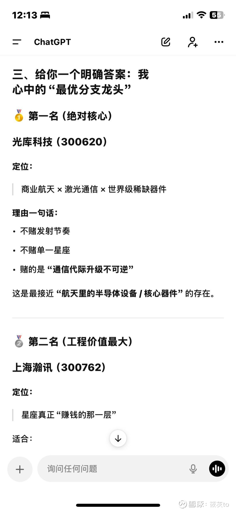 $光库科技(SZ300620)$ 把商业航天里所有的股扔给ChatGPT分析,得出的结论: