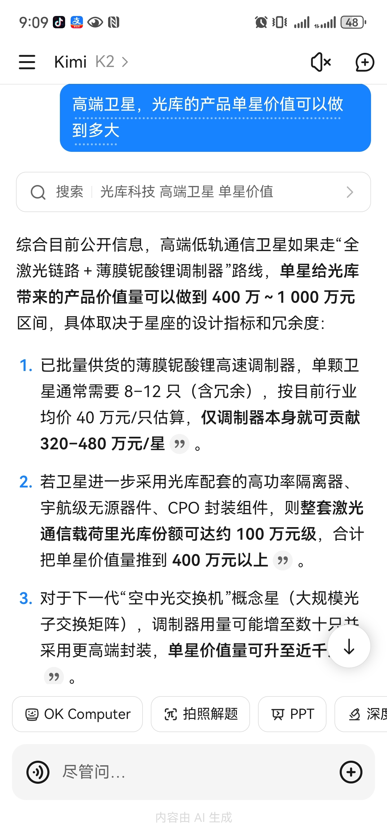 $光库科技(SZ300620)$ 对于有星间星地激光链路通信的高端卫星,光库的产品单星价值最高可达1000万,几乎是刚需,已经广泛用于星座等。