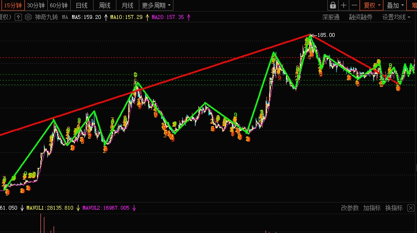 从十五分钟图来看,这轮上涨周期有11个浪,从185回调整理到今天最低的也刚好走了