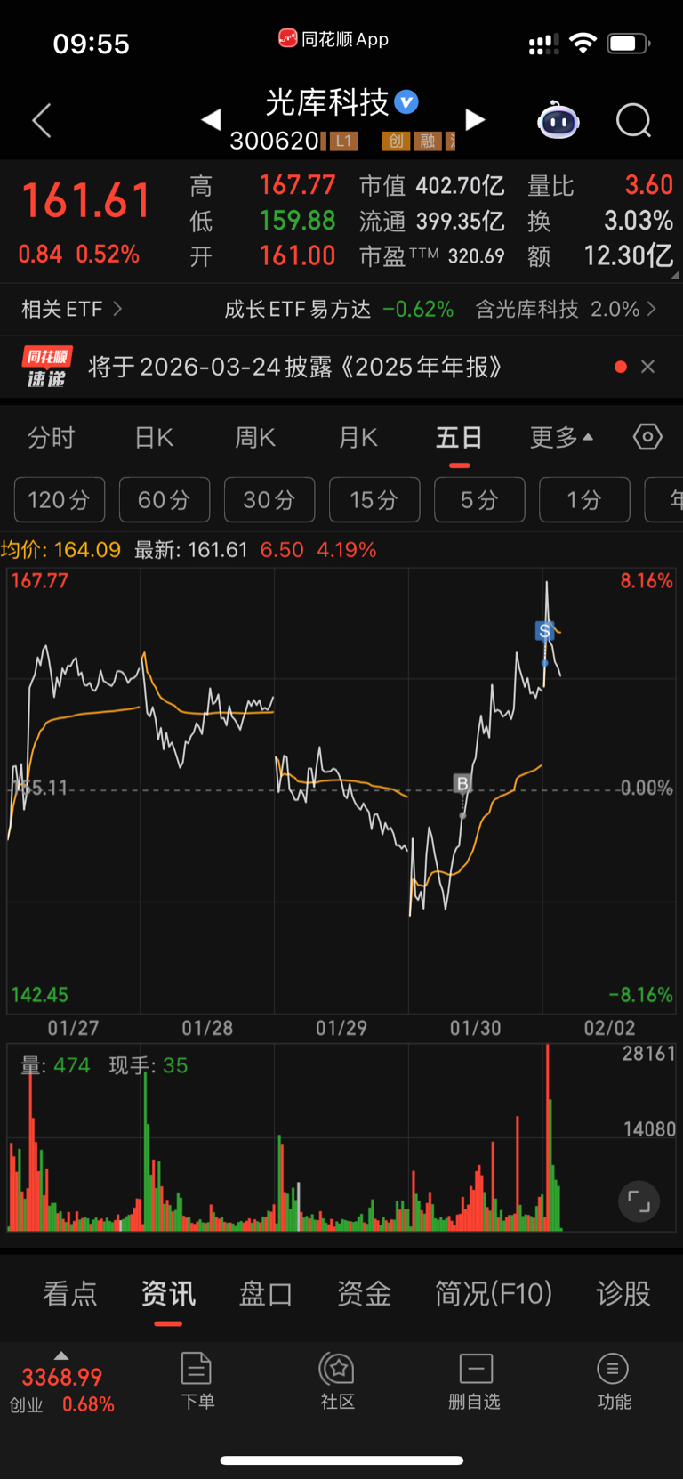 $光库科技(SZ300620)$ 早上科技一顿砸,吓得我卖在低点