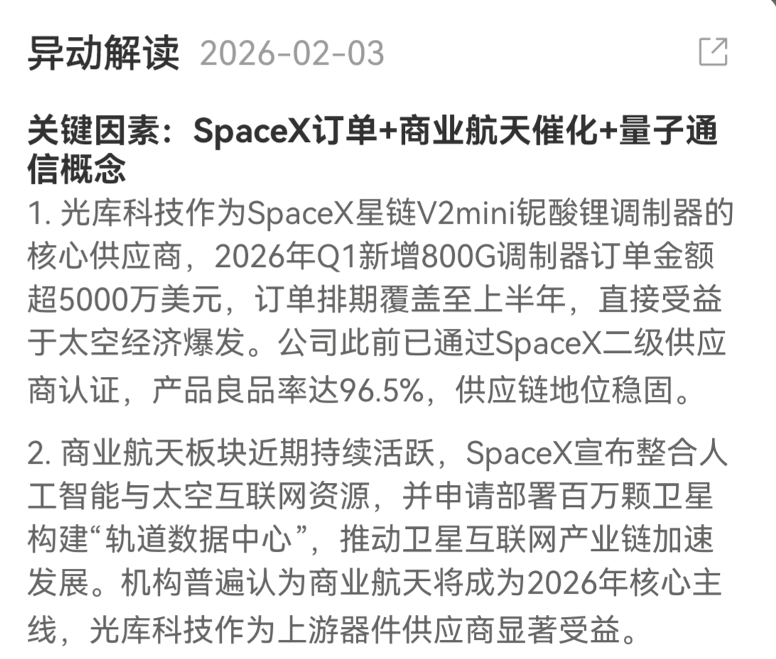 $光库科技(SZ300620)$ 恭喜光库起飞,入选航天板块,特供SpaceX