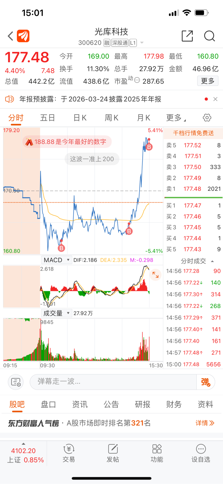 $光库科技(SZ300620)$ 先在光库科技里面待几天,再回去加仓铖昌,子弹都加仓在光库了。都是卫星的细分领域的国内唯一世界唯二,今天尾盘加仓光库是看见了马斯克团队考察国内光伏公司,那间接供货星链的“薄膜铌酸锂调制器”的光库科技是不是有预期?况且实际已经有星链5000万美元订单,并且目前订单排到2026年上半年。所以尾盘all in光库……纯粹看一下明天什么情况