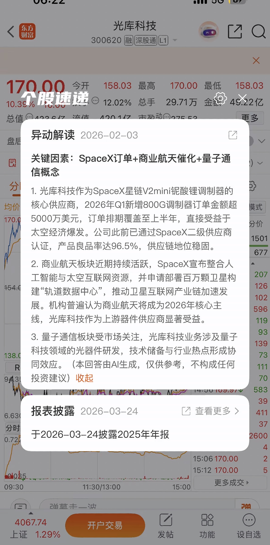 光库科技作为SpaceX星链V2mini酸锂调制器的核心供应商,2026年Q1新增800G调制器订单金额超5000万美元,订单排期覆盖至上半年,直接受益于太空经济爆发。公司此前已通过SpaceX二级供应商认证,产品良品率达96.5%,供应链地位稳固。