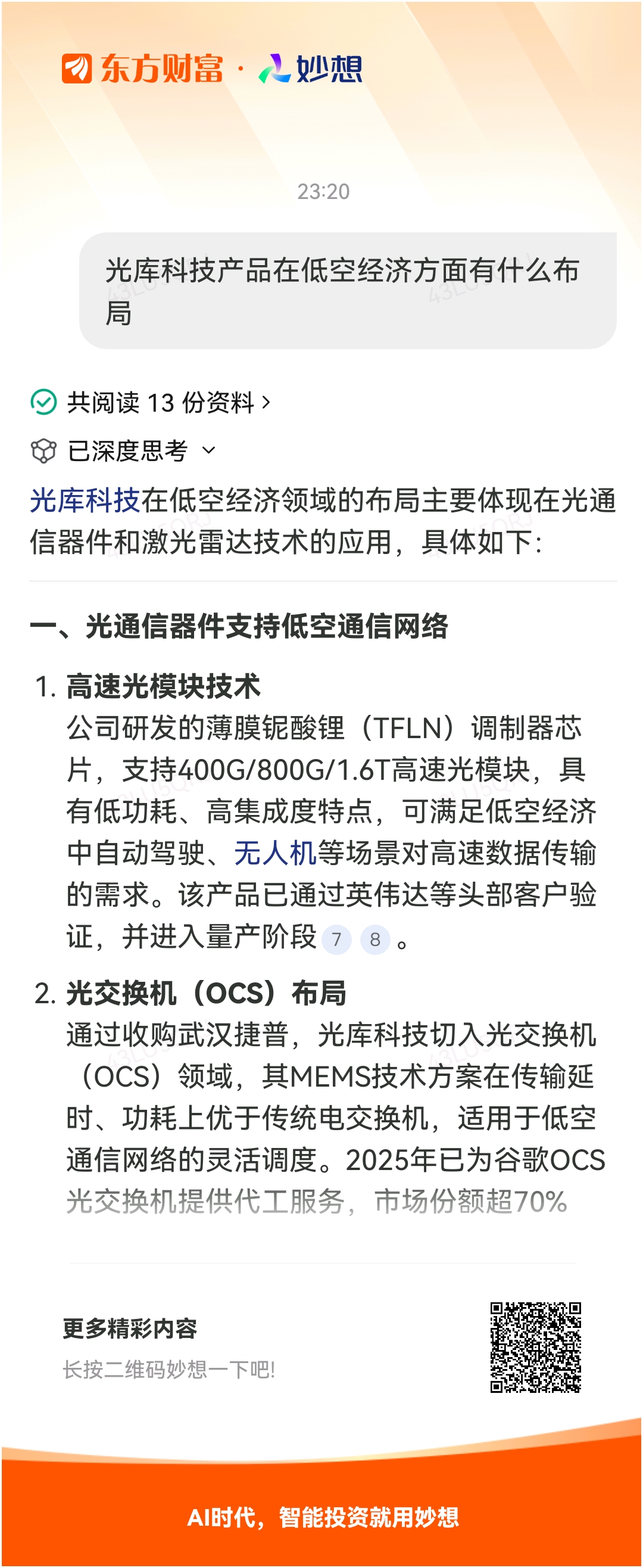 #@妙想,你怎么看?# 妙想一下:光库科技产品在低空经济方面有什么布局