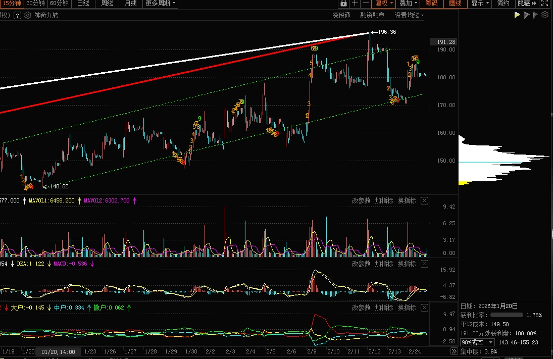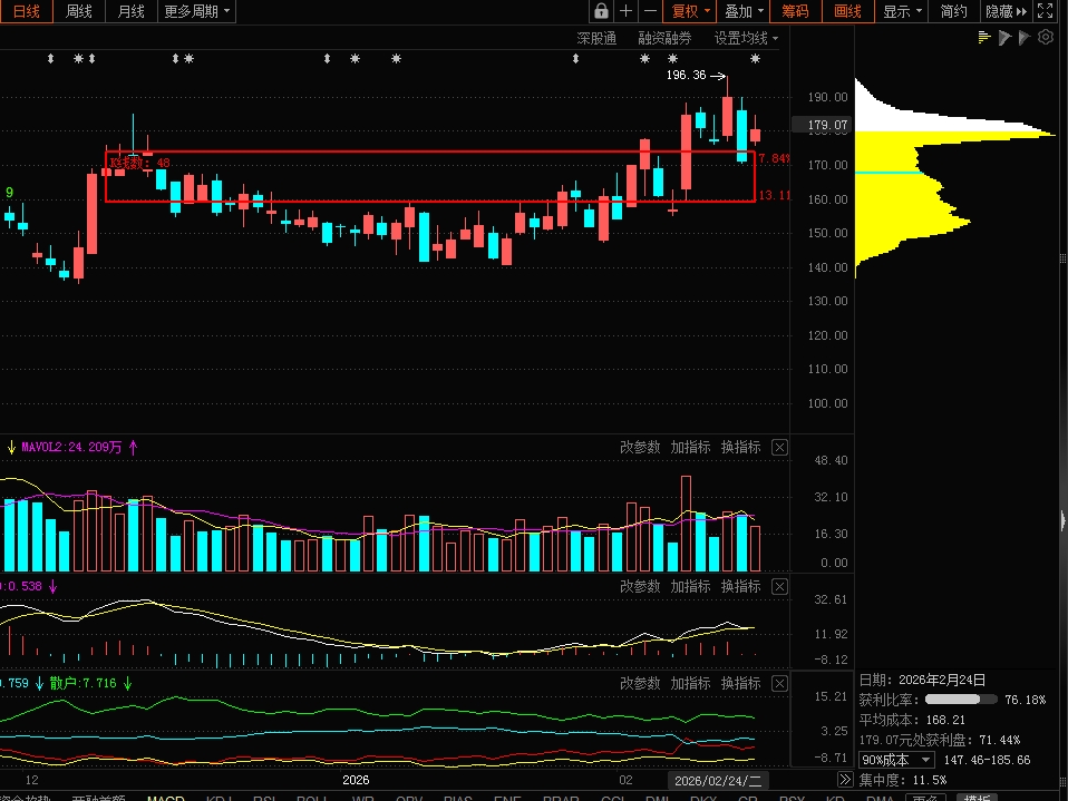 日线上正处于去年底高点和今年高点的震荡洗盘的中枢里,刚刚突破了这个中枢,现在正是回踩确认阶段,应该会很快离开这个中枢。