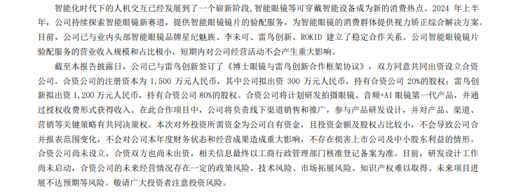 2024年8月,博士眼镜与雷鸟创新共同出资300万元成立合资公司,以研发拍摄眼镜、音频+AI眼镜第一代产品,博士眼镜出资300万元持股20%。11月,博士眼镜又与AR科技公司XREAL正式宣布达成战略合作,成为XREAL AR眼镜的深度合作伙伴。