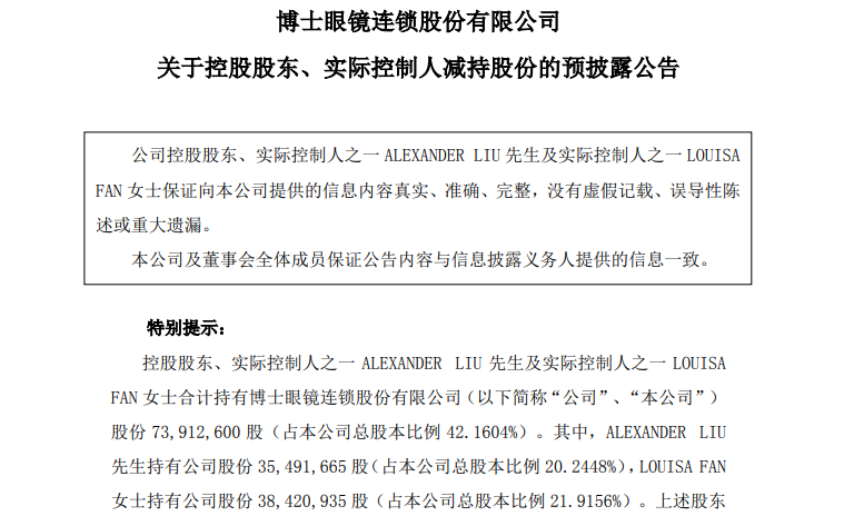 在股价大涨之前,博士眼镜刚刚宣布实控人减持计划。因个人资金需求,控股股东、实际控制人之一的ALEXANDER LIU和LOUISA FAN计划合计减持不超过472万股,占比为2.7%。目前,两人合计持有博士眼镜7391万股,占比42.2%。