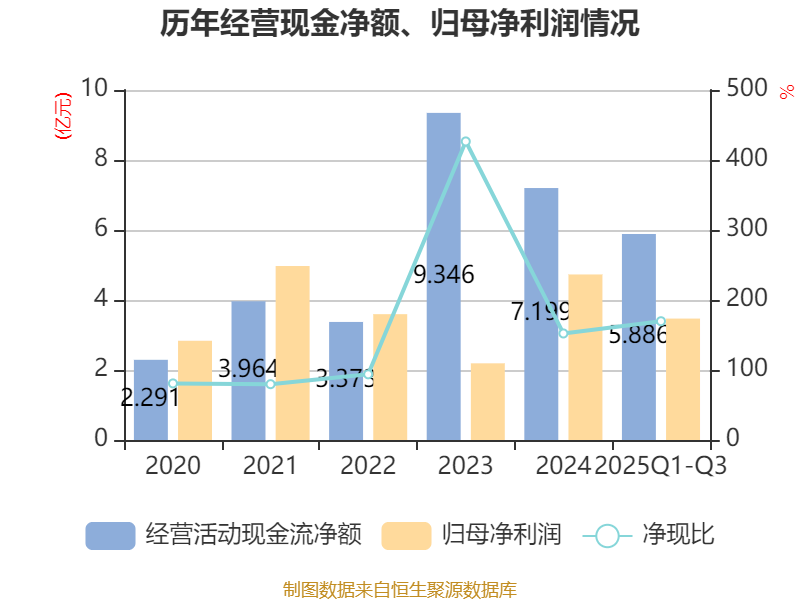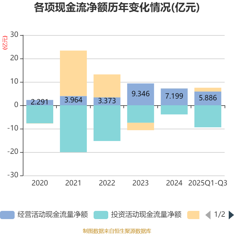 2025年前三季度,公司经营活动现金流净额为5.89亿元,同比增长7.98%;筹资活动现金流净额1.63亿元,同比增加5.32亿元;投资活动现金流净额-9.41亿元,上年同期为5301.64万元。