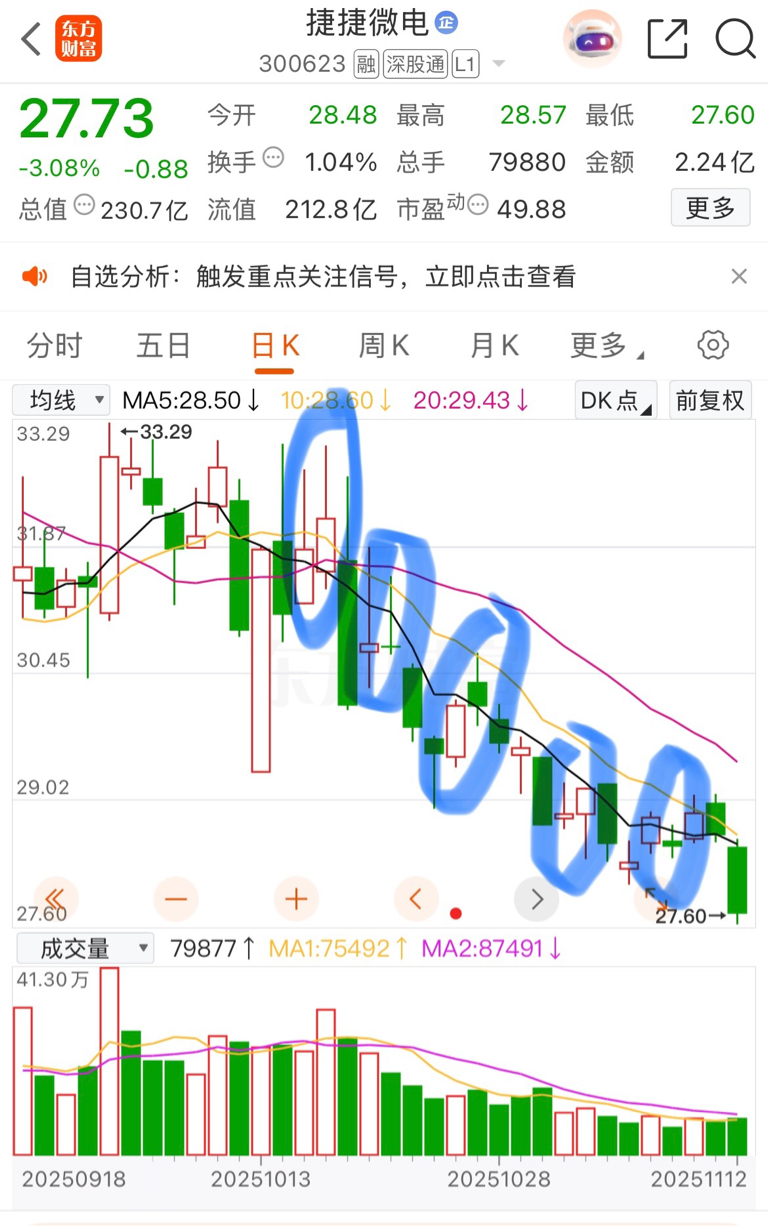 $捷捷微电(SZ300623)$ 一个月内5次反弹,每次反弹最高点不超过前一日大跌开盘价,这是有大资金在疯狂卖出啊,是机构吗?还是大股东?还是游资?按这个规律下次反弹的最高点不超过28.30