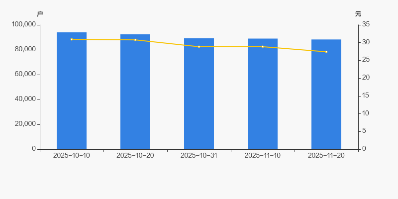 2025年10月10日至今,公司股东户数有所下降,区间跌幅为6.10%。2025年10月10日至2025年11月20日区间股价下降11.35%。