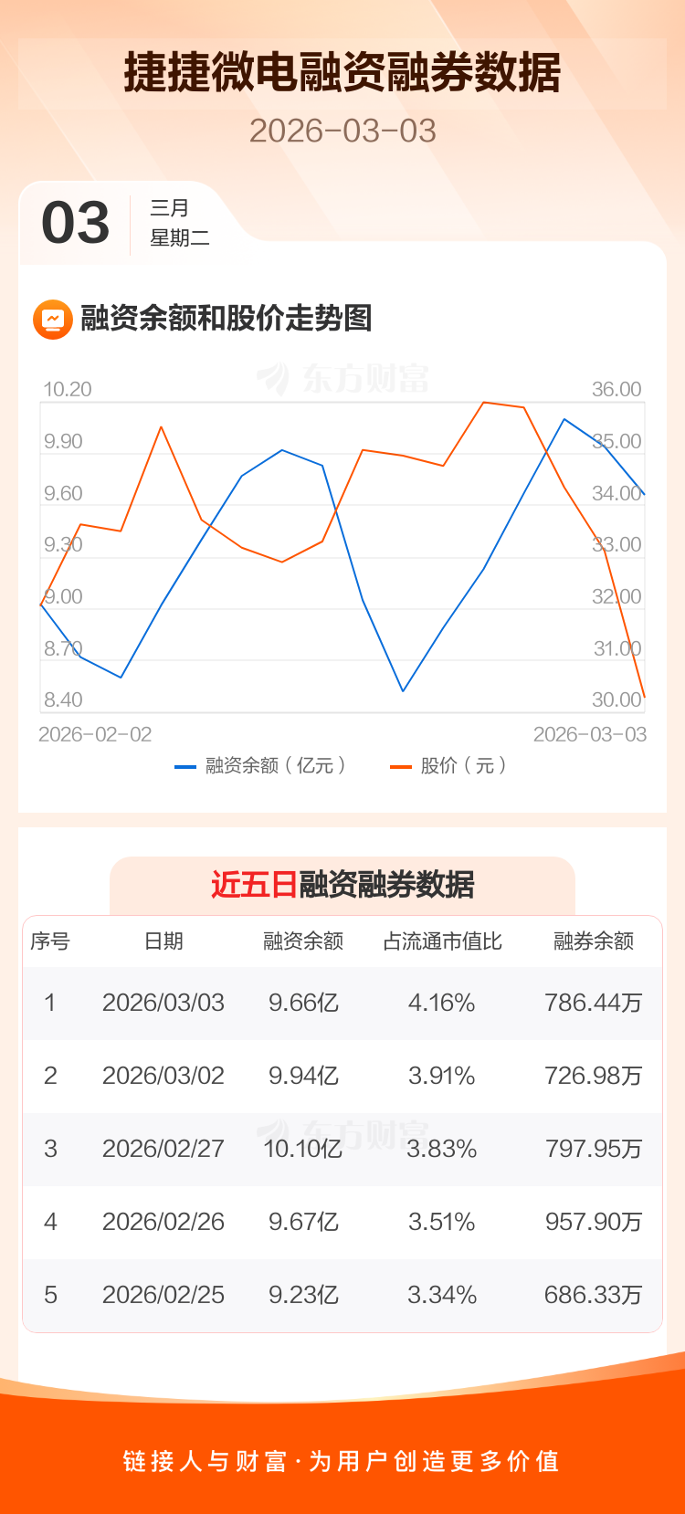 交易所最新数据显示,捷捷微电于2026年3月3日获融资买入1.04亿元,融资偿还1.32亿元,当日融资净偿还2774.22万元。目前,该股融资余额9.66亿,占流通市值比例为4.16%。