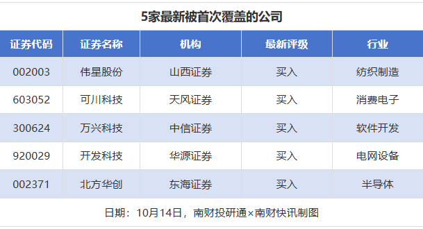 首次覆盖方面,10月14日券商共给出了5次首次覆盖,其中伟星股份获得山西证券给予“买入”评级,可川科技获得天风证券给予“买入”评级,万兴科技获得中信证券给予“买入”评级,开发科技获得华源证券给予“买入”评级,北方华创获得东海证券给予“买入”评级。