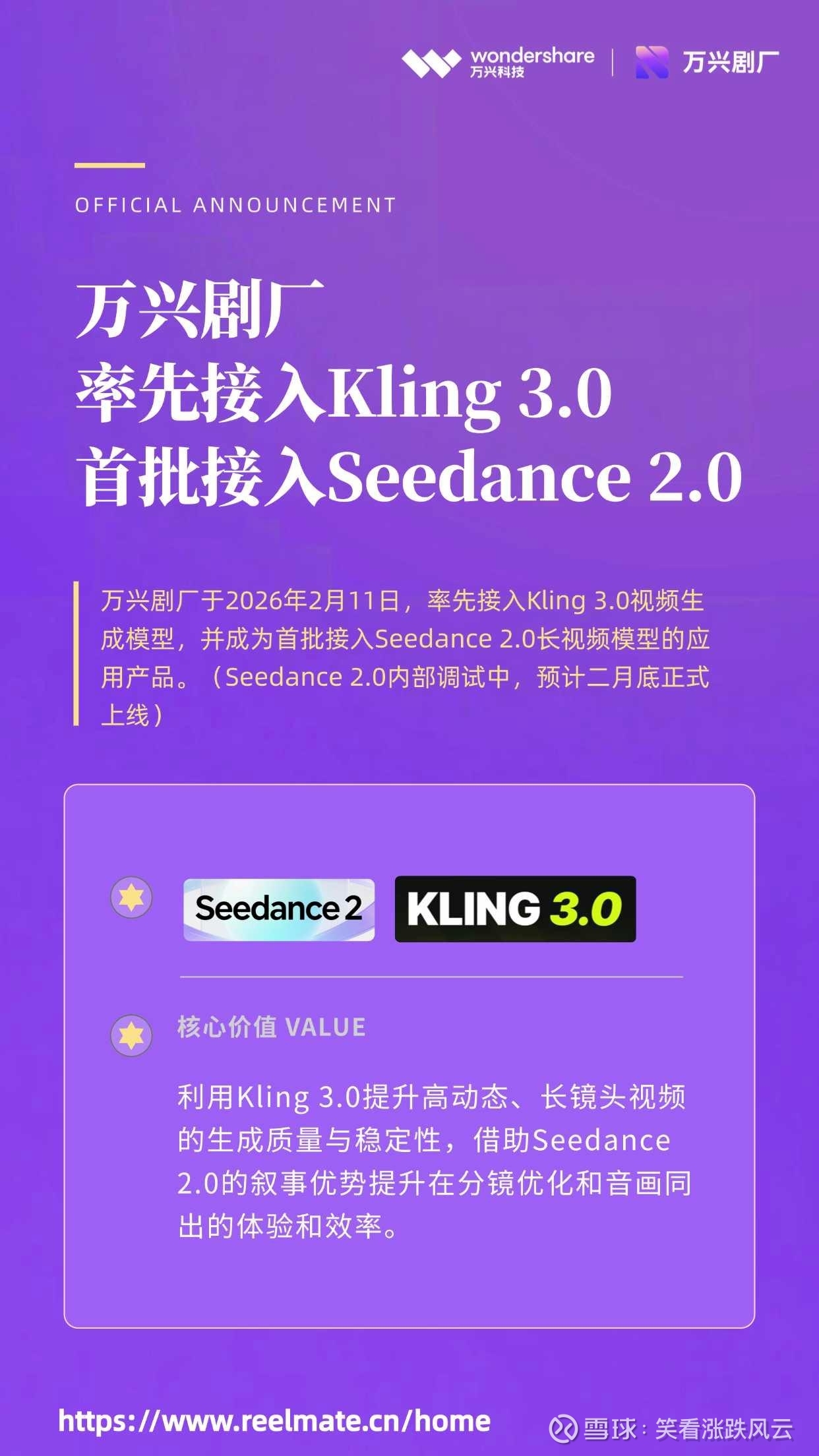 $万兴科技(SZ300624)$ 万兴剧厂首批接入seedance2.0应用产品