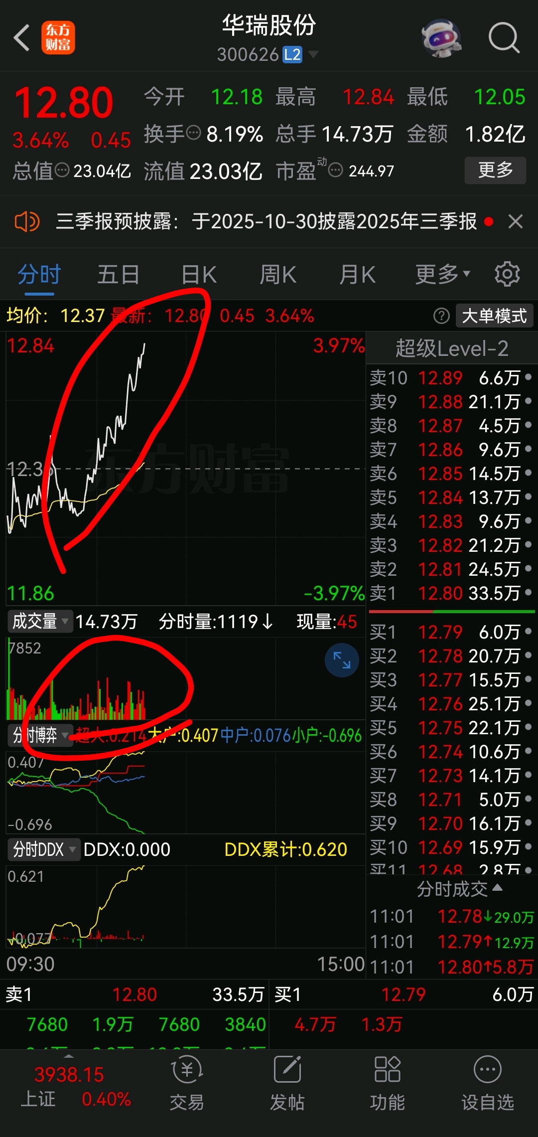 $华瑞股份(SZ300626)$ 这种形态是我最喜欢的,资金慢慢涨上去,想卖的随时能卖,散户想买,总想回踩买,可就是不回踩,眼看着上去,成交量上都是红色高亮柱买盘。没有大波动。