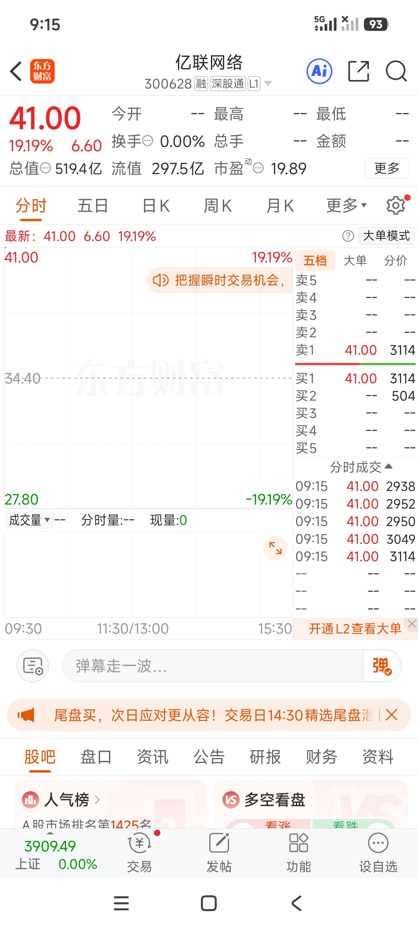 $亿联网络(SZ300628)$ 哪个大神涨停试盘?