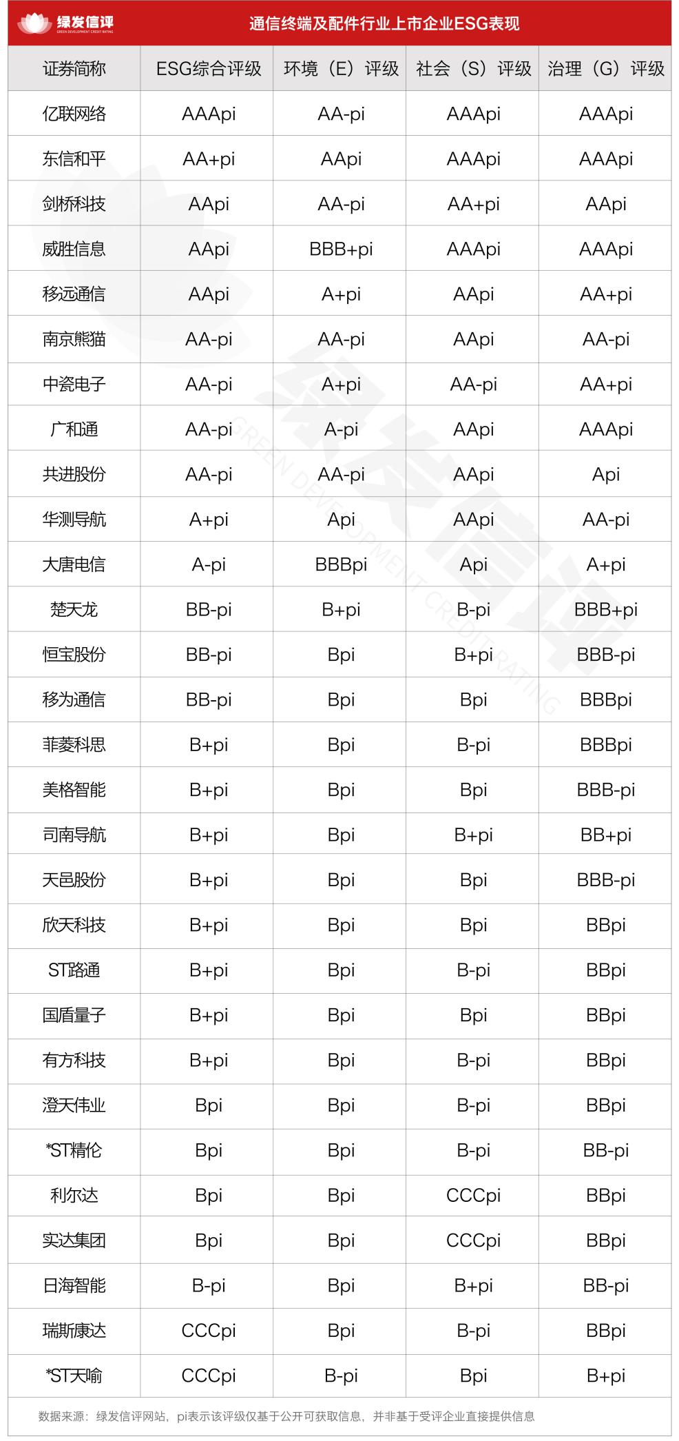中国财富网讯在全球数字经济加速演进与“双碳”目标持续深化的双重驱动下,通信终端及配件行业作为信息传输的物理入口与网络覆盖的关键节点,正迎来“ESG赋能终端智造”的关键转型期。近日,海南绿色发展信用评级有限公司(以下简称“绿发信评”)发布A股通信终端及配件行业ESG主动评级结果,清晰勾勒出行业ESG发展图谱:以绿色设计牵引低碳转型、以供应链穿透管理夯实社会责任、以治理体系完善筑牢合规底线,正成为通信终端及配件企业推进可持续发展的三条共性路径,ESG价值在行业各环节持续释放。