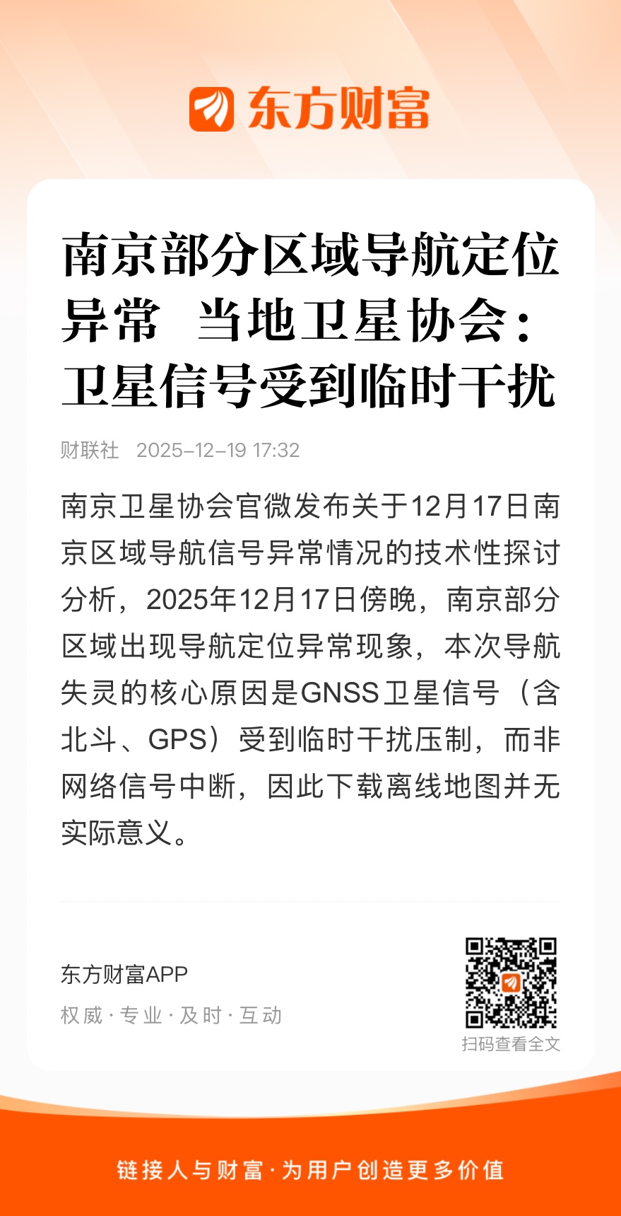 南京卫星协会官微发布关于12月17日南京区域导航信号异常情况的技术性探讨分析,2025年12月17日傍晚,南京部分区域出现导航定位异常现象,本次导航失灵的核心原因是GNSS卫星信号(含北斗、GPS)受到临时干扰压制,而非网络信号中断,因此下载离线地图并无实际意义。