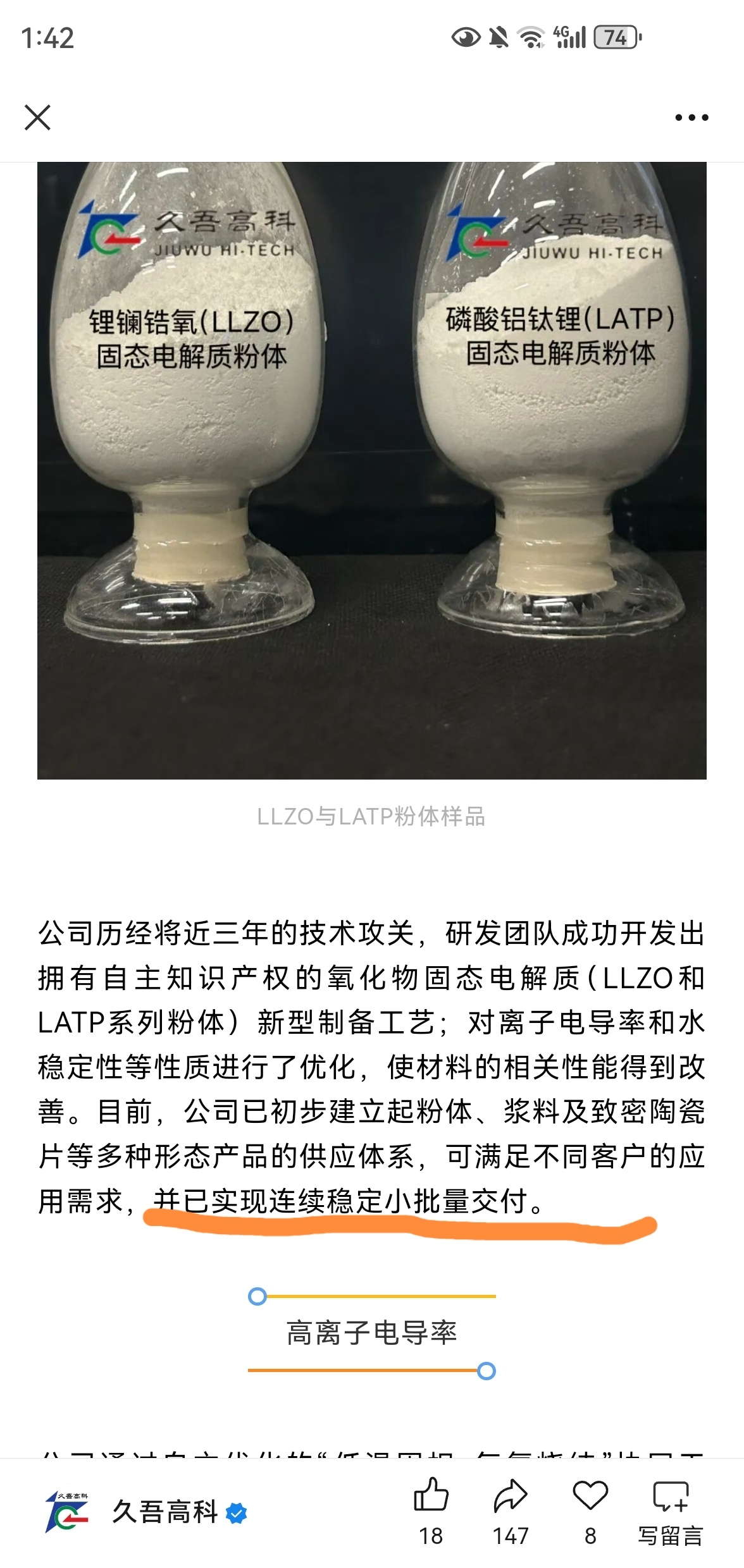 $久吾高科(SZ300631)$ 公众号上的信息,这个公司还真有固态电池电解质,并且给国内知名电芯厂供货了