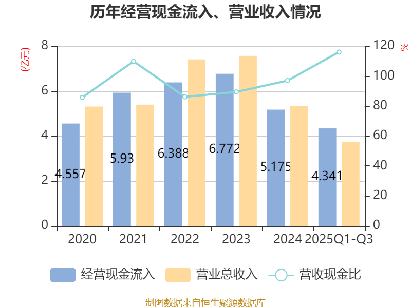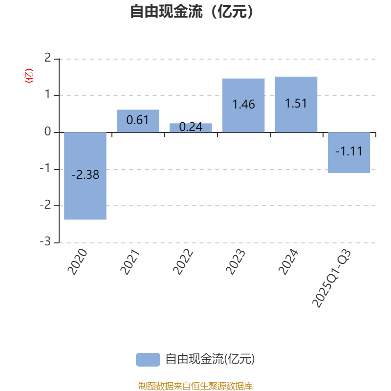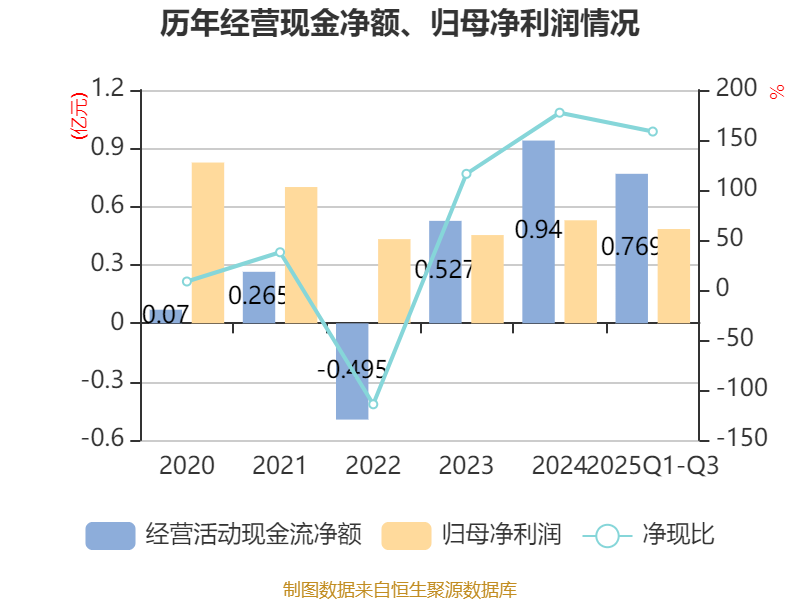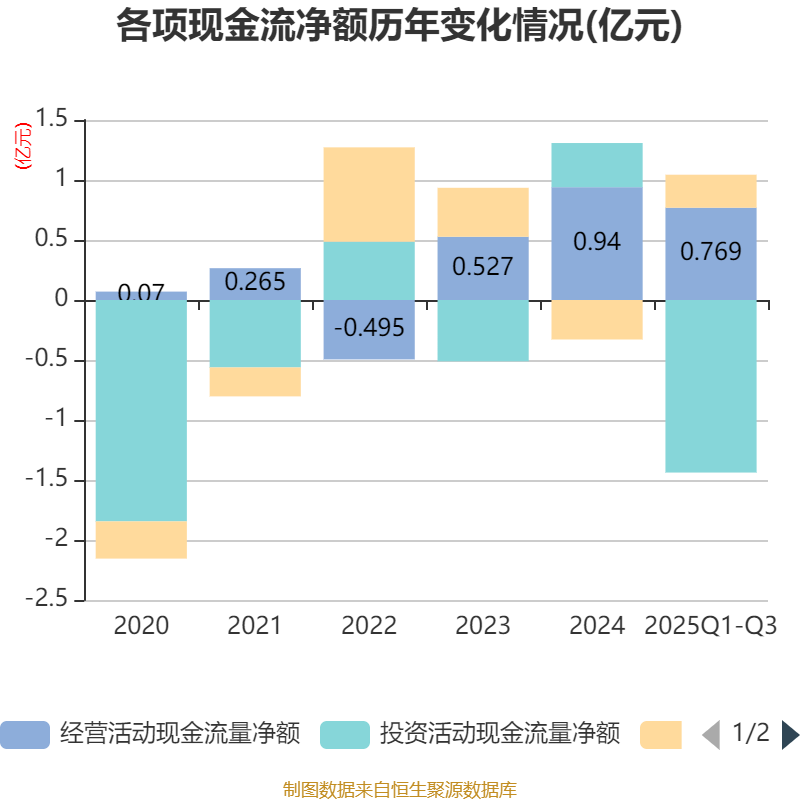 2025年前三季度,公司经营活动现金流净额为7690.66万元,同比增长24.3%;筹资活动现金流净额2753.55万元,同比增加4446.86万元;投资活动现金流净额-1.44亿元,上年同期为-8235.48万元。
